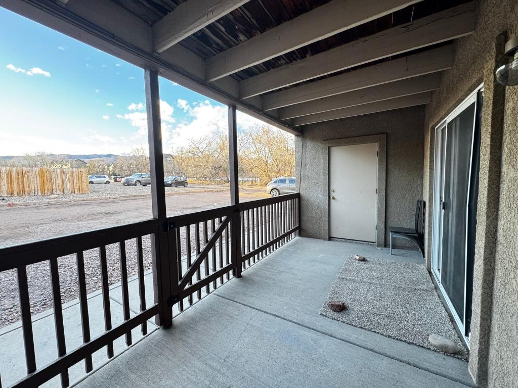 As you step into this charming unit, you're welcomed by a spacious living room featuring a cozy wood-burning fireplace, perfect for those chilly winter nights. The room flows into the kitchen that has a built in breakfast bar perfect for quick easy meals. Down the hall, youll find two generously sized bedrooms with ample closet space, along with a full bathroom. Off the living room you have a sliding glass door that leads to a private, covered concrete patio, ideal for relaxing or enjoying the outdoors. A gate from the patio provides convenient access to the parking lot. It is in a great central location, close to I-25 with easy access to the entire city. Additionally, the well-maintained community laundry area with coin-operated machines is just outside your door, simplifying laundry day. This spacious yet cozy 2-bedroom, 1-bathroom unit is ready for you to make it your home. Cross Streets- Garden of the Gods Rd & Centennial Blvd A/C- No R, R/O, Dw, Ds Community Coin Operated Laundry Water and Trash Included *Special requirements: No pets allowed
