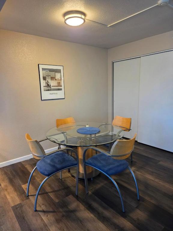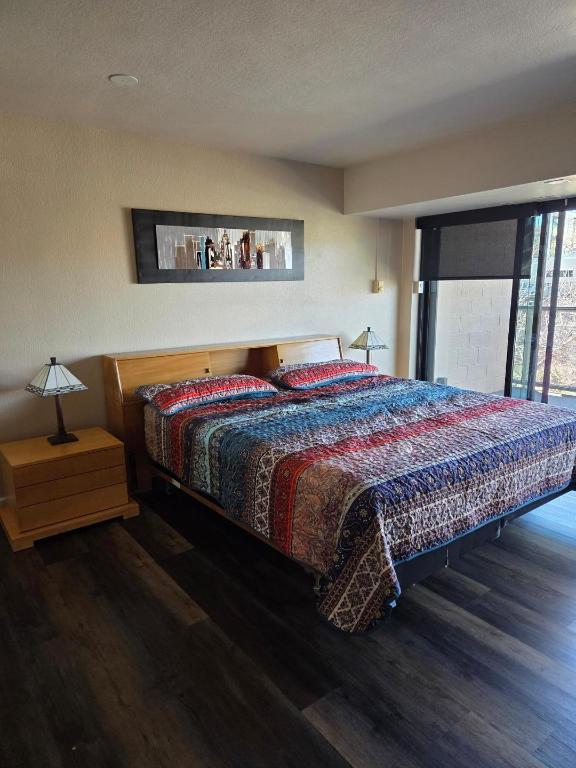 Furnished Mid term rental. Large Executive WEST facing 1 Bedroom 2 Bathroom Loft w/garage parking. This downtown west-facing modern loft features new LVP wood flooring throughout, with two walkouts to the west-facing balcony. The master bedroom is large with a king bed, and an adjoining full bath. Separate dining area and breakfast bar. Close to highway access, shopping, UCCS ,Ft. Carson and more. Bonus included: fitness center, sauna, billiards room, and a gated 1 car garage or space